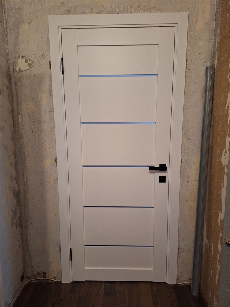 Межкомнатная царговая дверь серии EMALEX. Эмалекс - инновационный многослойный экошпон с защитным слоем лака (Германия), имитация эмали, Бескромочная технология; полнотелая конструкция. Царговые - представляет собой конструкцию, где каркас-основа состоит из вертикальных и поперечных стоек, изготовленный из древесного массива и МДФ. Далее заполнение происходит горизонтальными планками. Все элементы бесшовны. Отличительная черта царговых изделий является наличие большого количества элементов, которые можно заменить, не прибегая к полному демонтажу изделия. Стекло - White Cloud - белое сатинированное с бархатистой текстурой. Не остаются отпечатки пальцев.